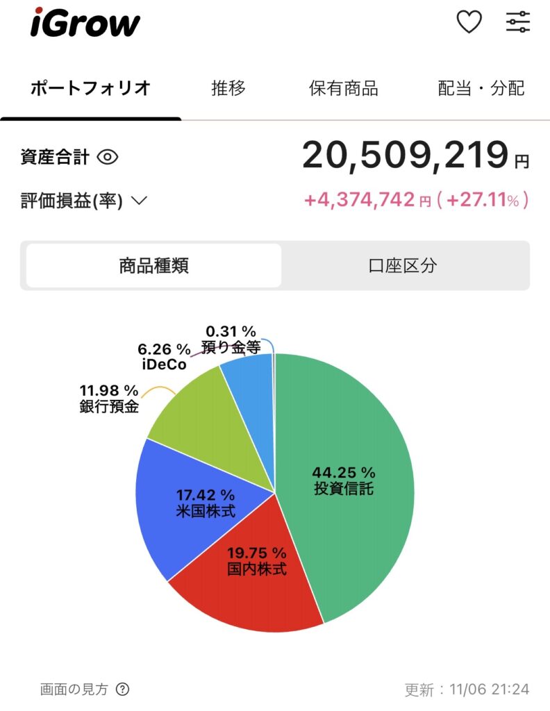 • iGrow表示の評価損益は+4,374,742円(+27.11%)。増やし方と次回の改善点をメモ。