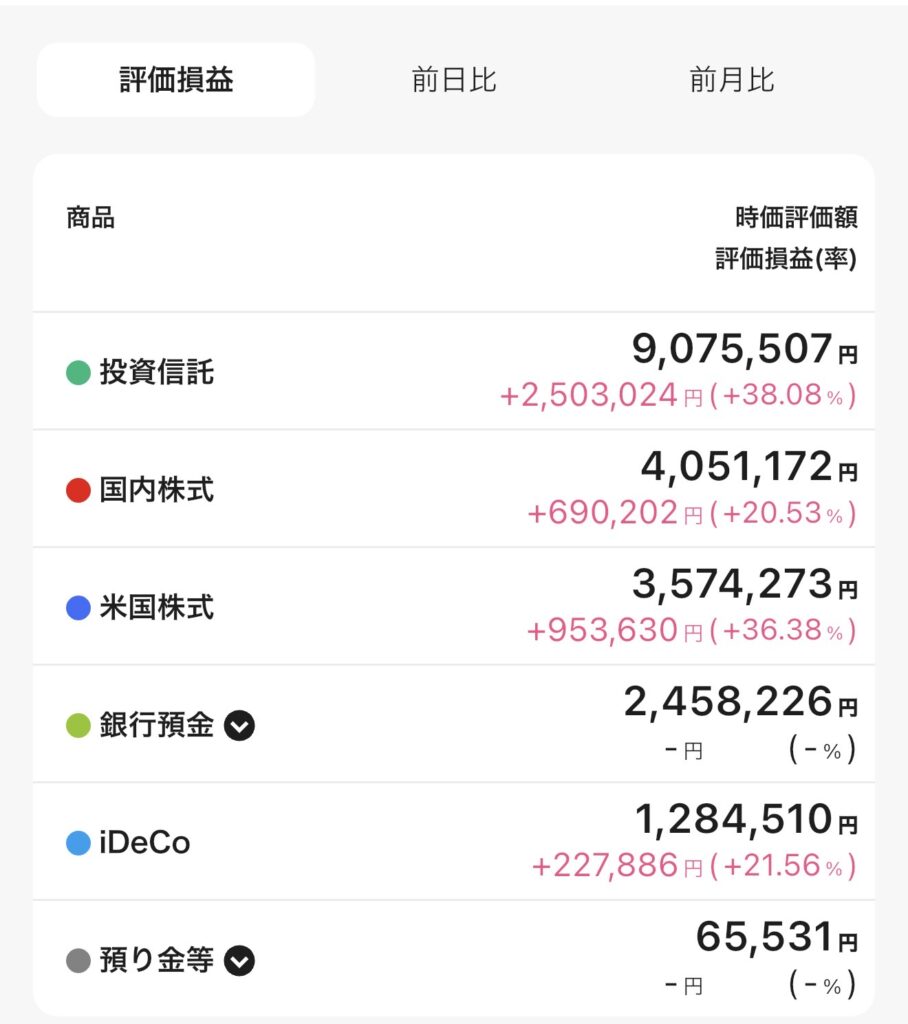 • 評価損益の内訳リスト(投信・国内株・米株・預金・iDeCo・預り金等)